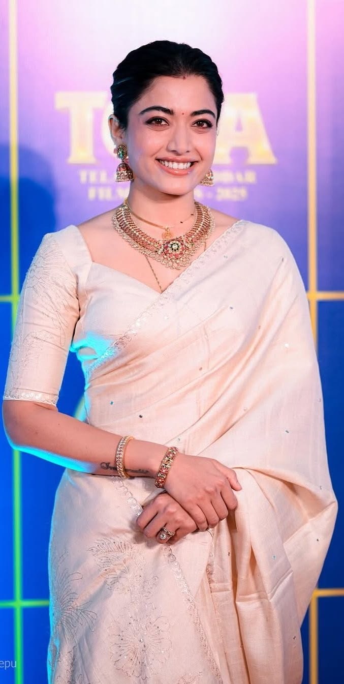 गोल्डन साड़ी में रश्मिका मंदाना का यह लुक बेहद सिंपल, एलिगेंट और ग्रेसफुल लग रहा है। मिनिमल ज्वेलरी और सॉफ्ट मेकअप उनके नेचुरल चार्म को और निखारते हैं